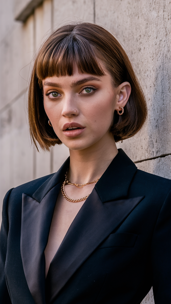 This classic French bob is styled with blunt bangs that frame the face beautifully. The rich brunette shade and chin-length cut create a timeless, elegant look. Perfect for a refined, professional style that highlights facial features effortlessly.