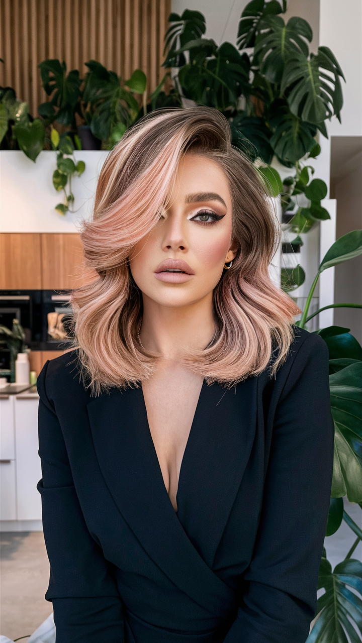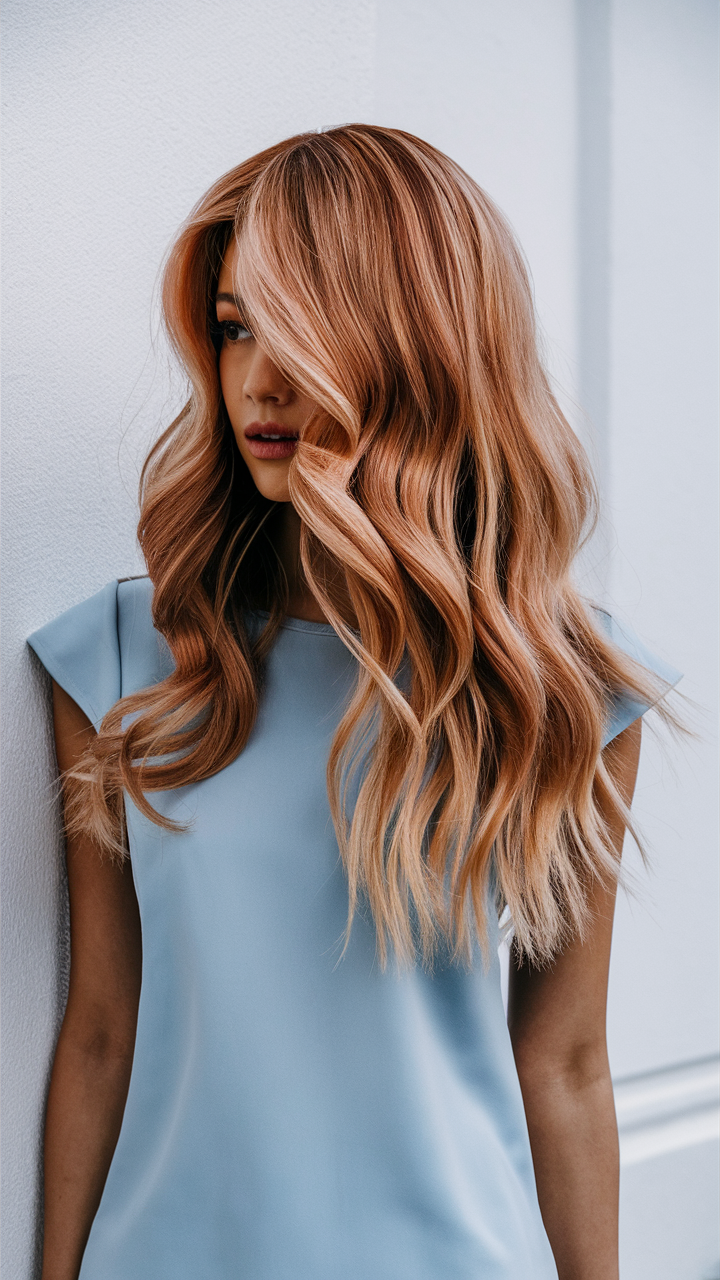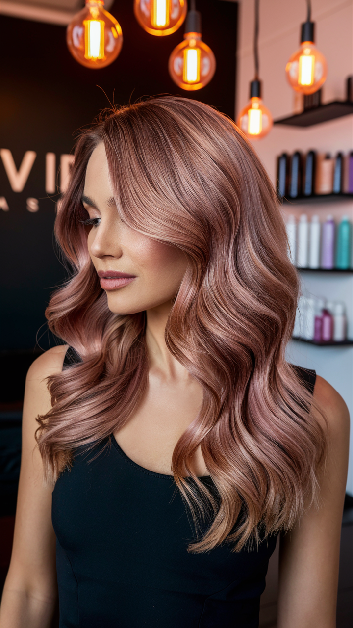 This hairstyle showcases a stunning rose gold balayage with flowing, voluminous waves. The soft layers add texture and movement, enhancing the warmth of the rose tones. Ideal for long hair, this look is both trendy and sophisticated for 2025.