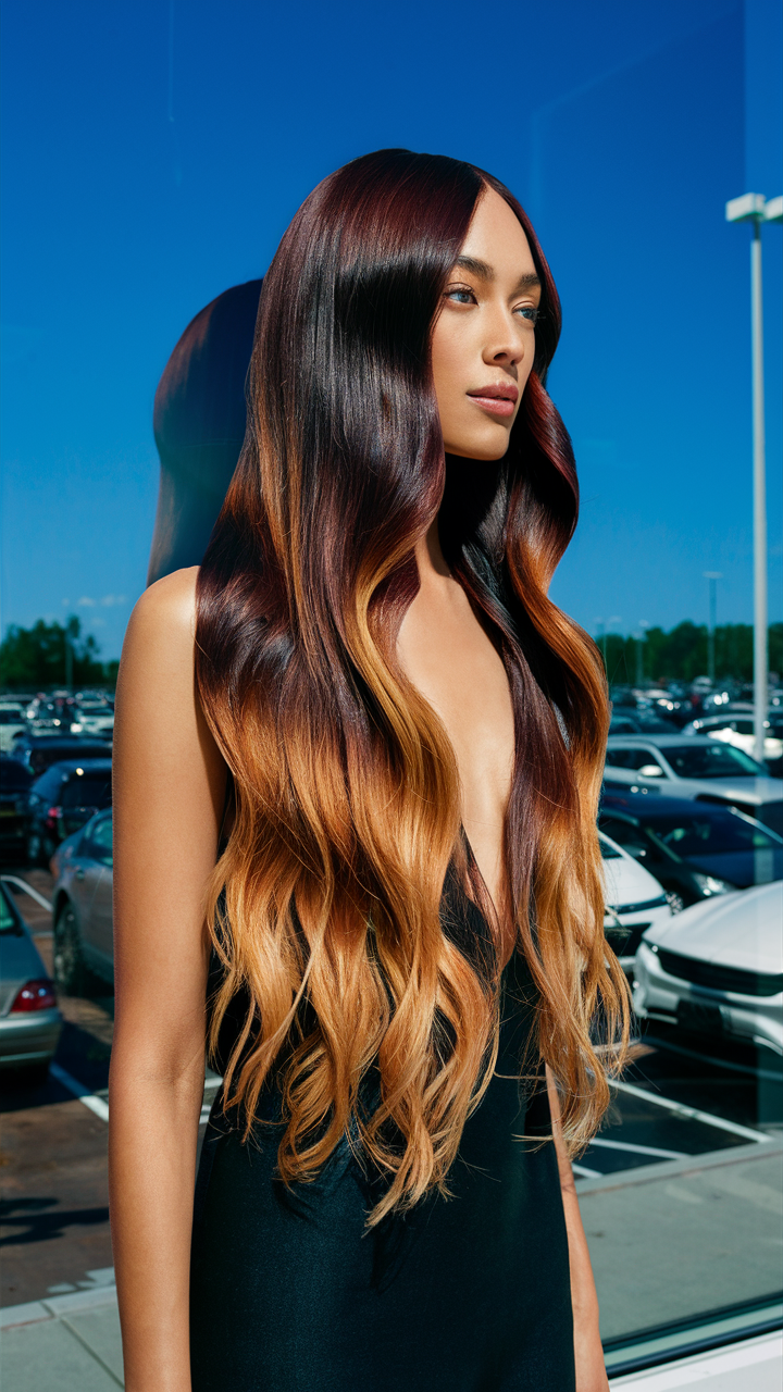 This hairstyle transitions from a rich burgundy at the roots to a vibrant golden blonde at the tips. The ombre effect adds depth and drama, creating a captivating gradient along the long, flowing waves. Ideal for those seeking a bold and warm-toned balayage.