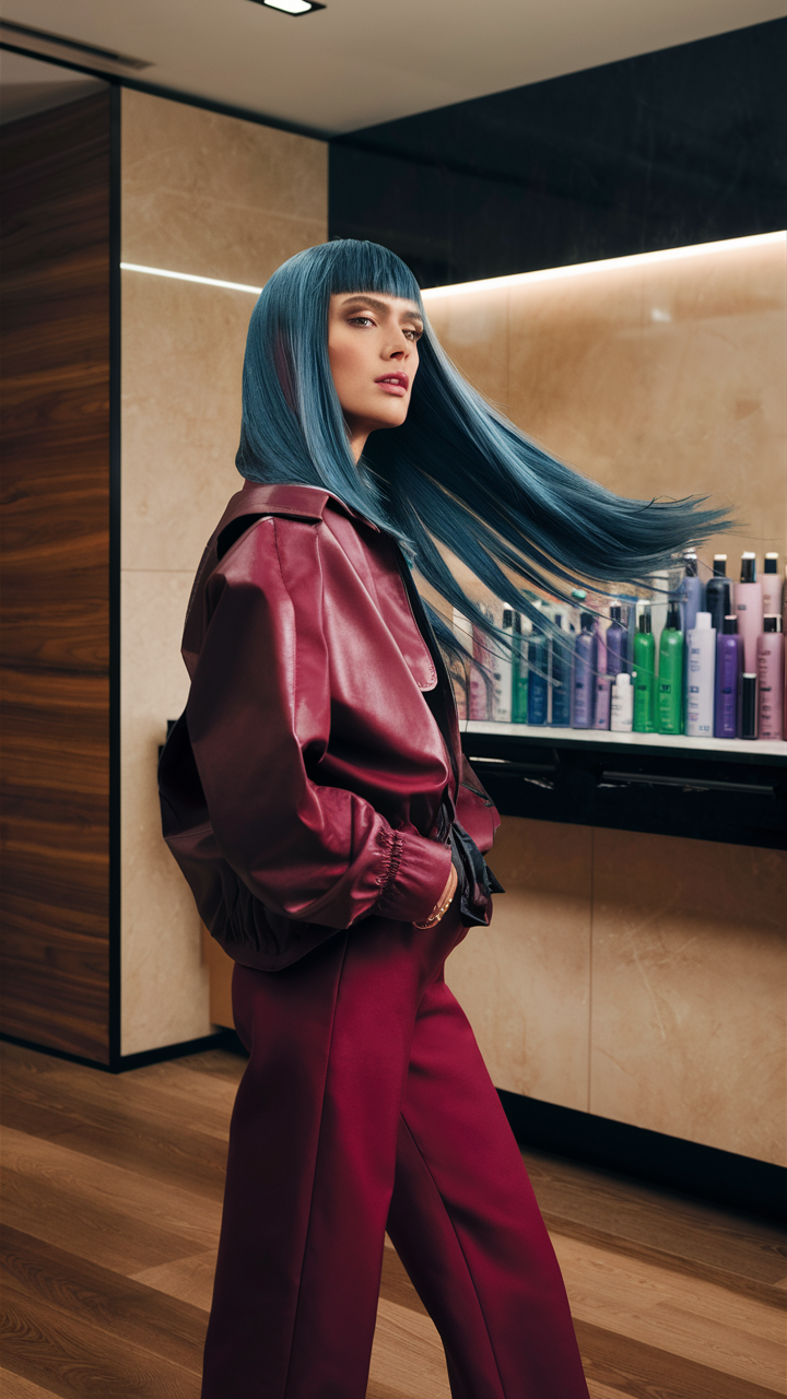 A daring look, this style showcases a sleek blue-gray color with blunt bangs for a bold statement. The smooth, straight texture adds a futuristic touch, highlighting the unique color. Ideal for those wanting a vibrant, high-fashion appearance.