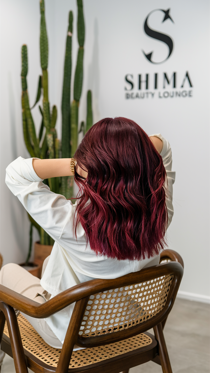 This medium-length hairstyle features rich, deep burgundy waves, adding warmth and intensity to the look. The subtle layers provide texture and movement, making the color appear dynamic and full of life. Perfect for a bold, sophisticated style.