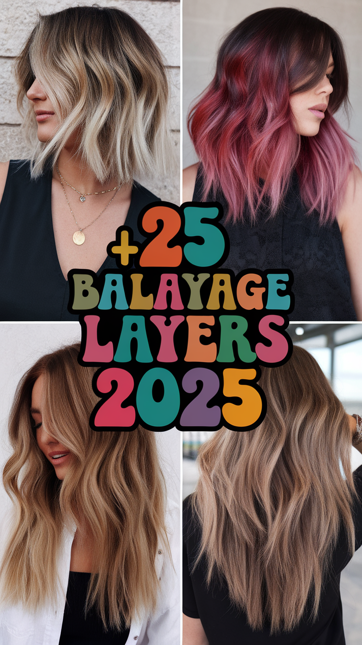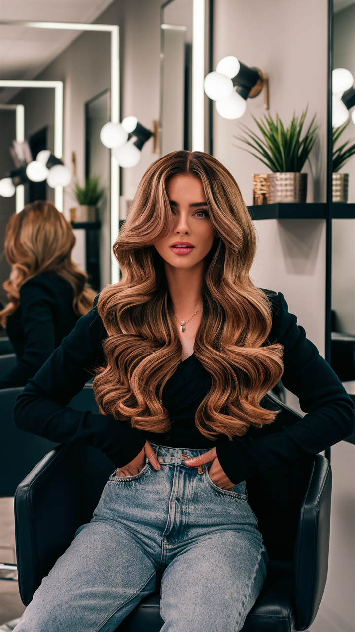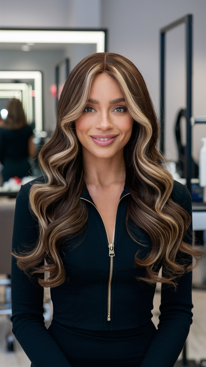 This hairstyle features a dark brunette base with bold platinum blonde streaks, adding contrast and dimension. The long waves enhance the face-framing highlights, creating a striking and modern look. Perfect for a glamorous yet edgy style in 2025.