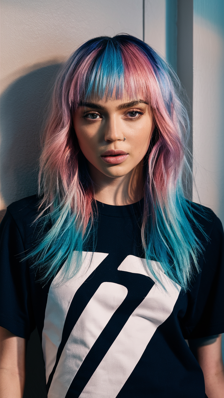 This playful style features a pastel ombre blending pink and blue tones. The wavy layers and soft fringe add texture, while the vibrant colors make a bold fashion statement. Ideal for those looking to stand out with creative color.