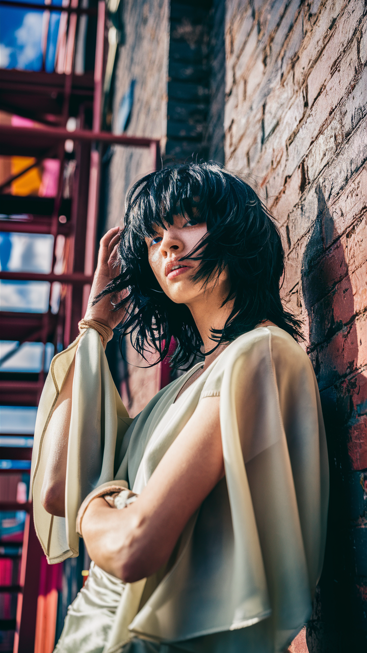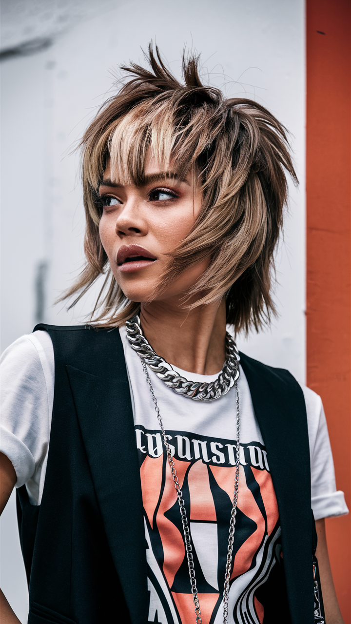 This edgy shag cut includes bold layers and highlighted bangs for a unique, modern twist. The mix of dark and light tones in the fringe adds contrast, enhancing the choppy texture. It’s a standout look for those craving an expressive, rock-inspired style.