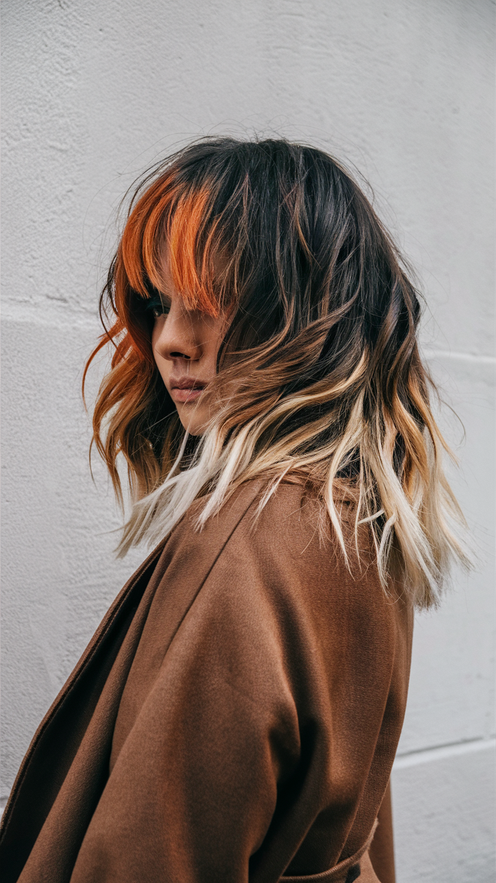 This medium-length shag combines dark roots with vibrant orange highlights, blending into blonde at the tips. The choppy layers enhance the color transition, adding depth and dimension to the look. Perfect for those looking to add a pop of bold color to a classic shag.