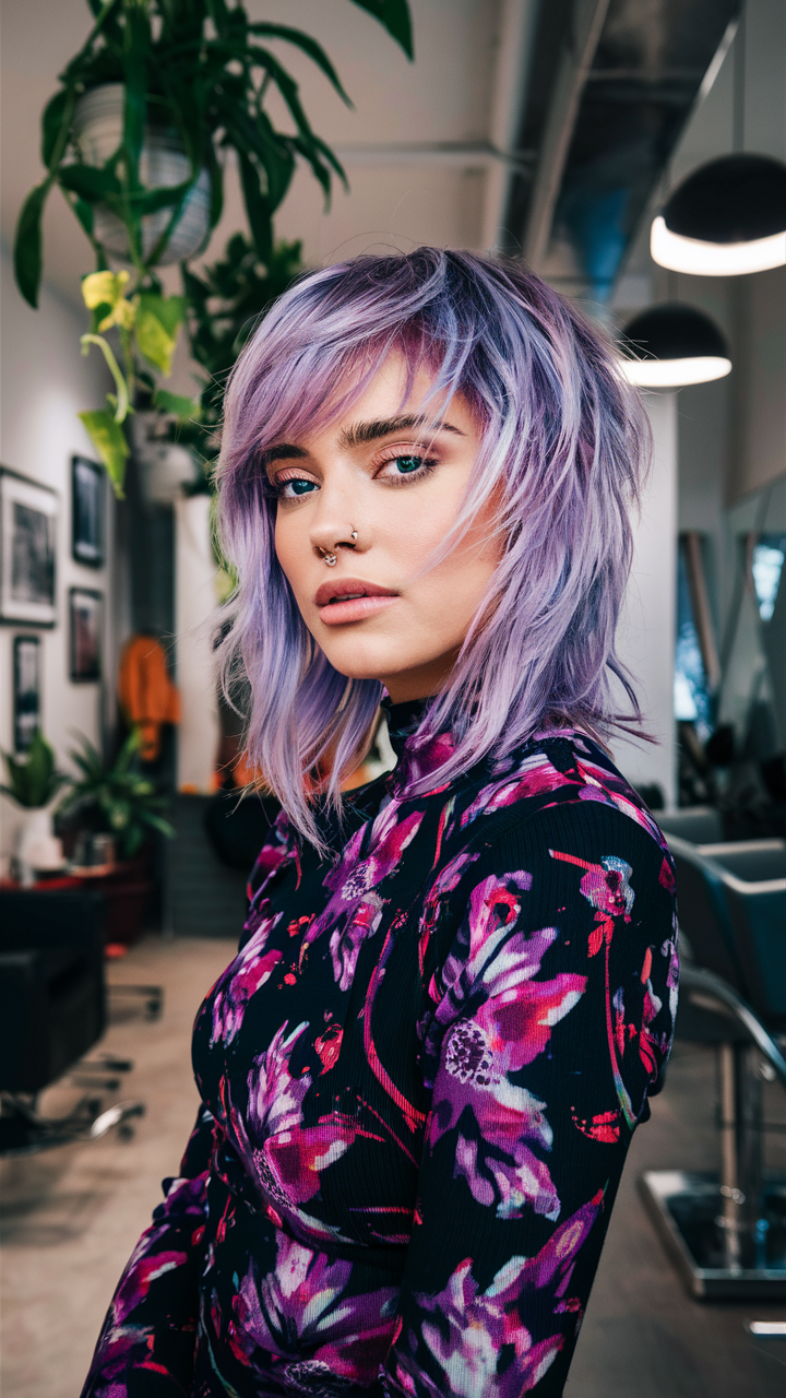 A shoulder-length shag in pastel lilac brings a unique twist to this layered cut. The soft, textured layers and subtle fringe create a dreamy, modern vibe with plenty of movement. This look is ideal for anyone embracing vibrant, trendy colors in their hairstyle.