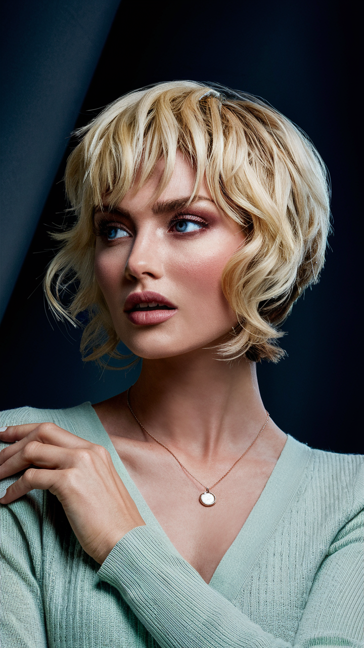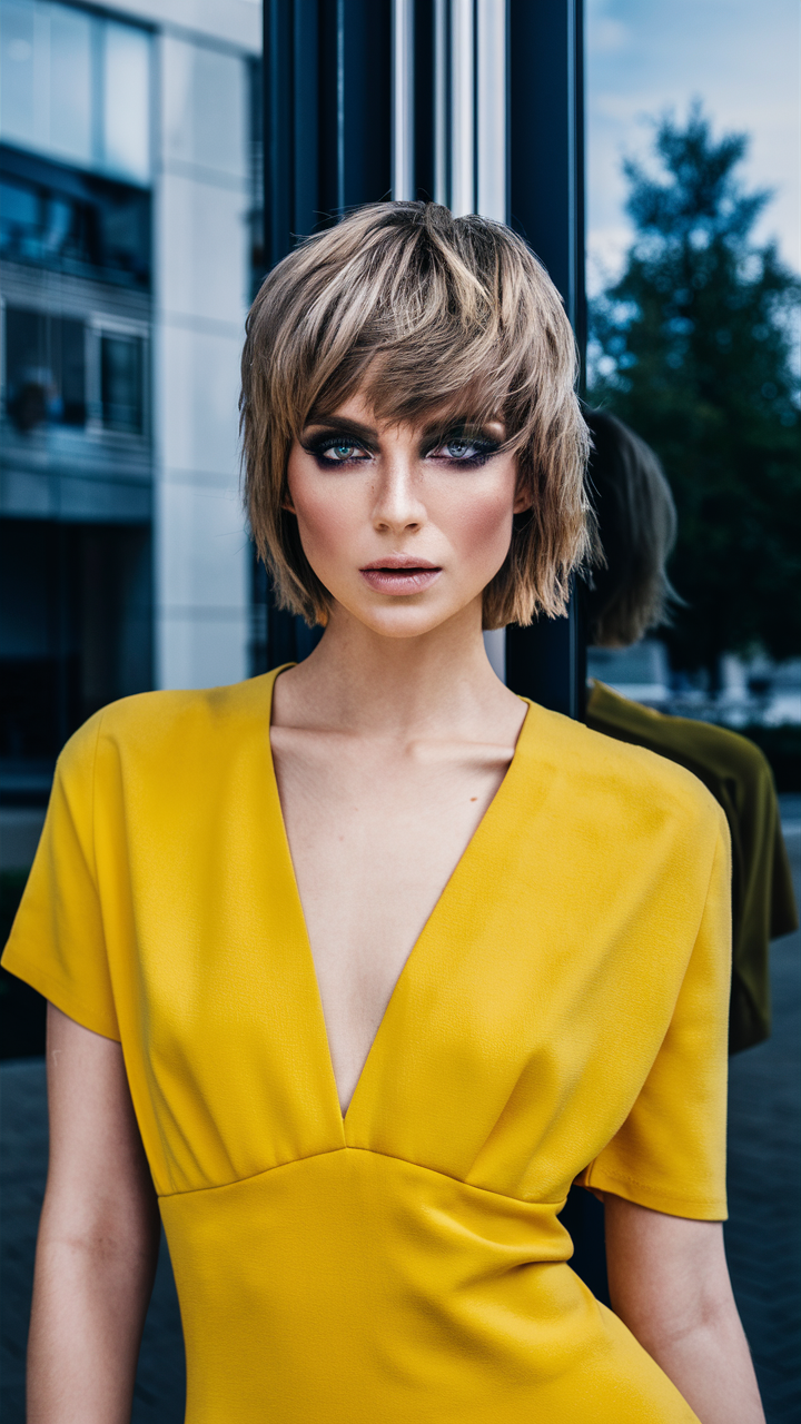 This short, textured shag features wispy layers that create a soft, undone look. The sandy blonde shade adds warmth and dimension, while the choppy bangs give it an edgy finish. Ideal for anyone seeking a low-maintenance yet stylish cut.