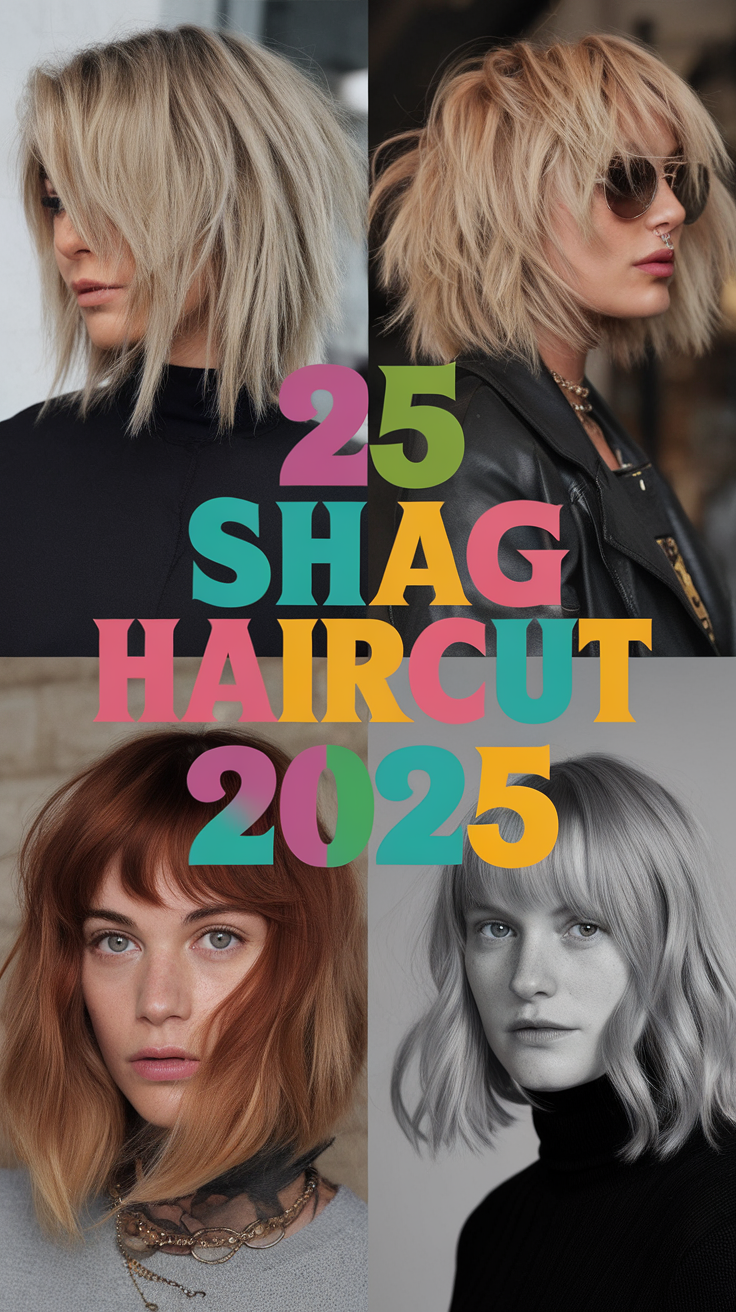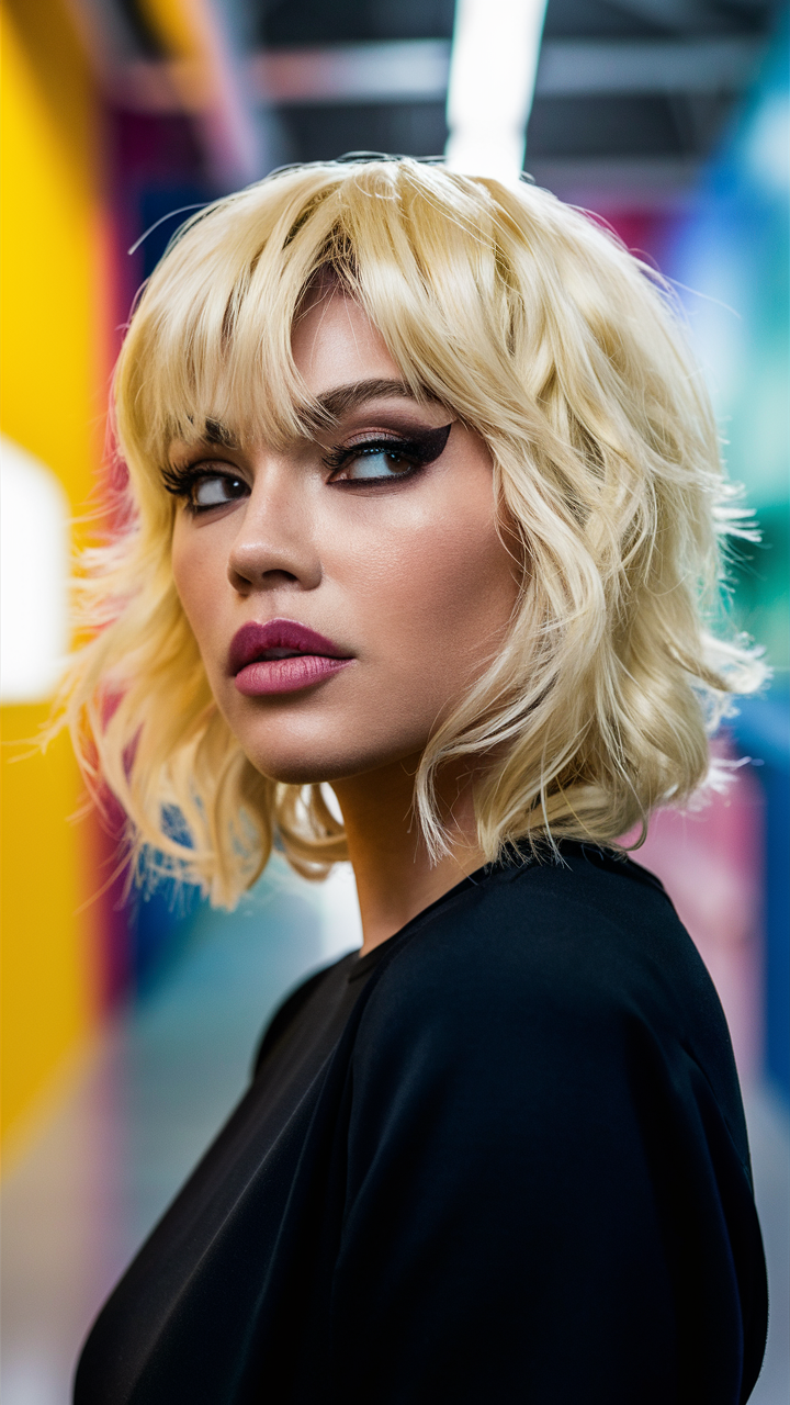 This blonde shag has wavy, shoulder-length layers that add volume and bounce to the style. The soft, feathered bangs frame the face beautifully, creating a playful, beachy look. Ideal for those who love a casual yet stylish, sun-kissed appearance.