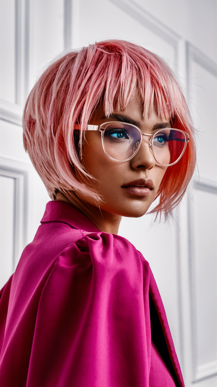 This pastel pink bob combines a sleek, chin-length cut with blunt bangs for a bold statement. The vivid color and smooth layers give the style a polished, contemporary look. Perfect for anyone looking to stand out with a playful, colorful hairstyle.