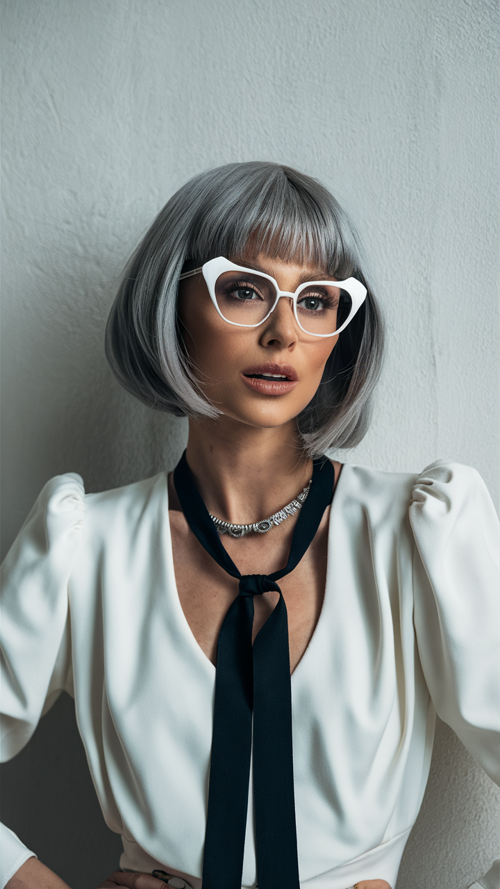 This silver bob embraces a modern shaggy texture with subtle layers that create movement. The classic fringe falls just above the brows, adding a sophisticated touch to the icy gray color. It’s a chic, timeless look with a trendy edge.