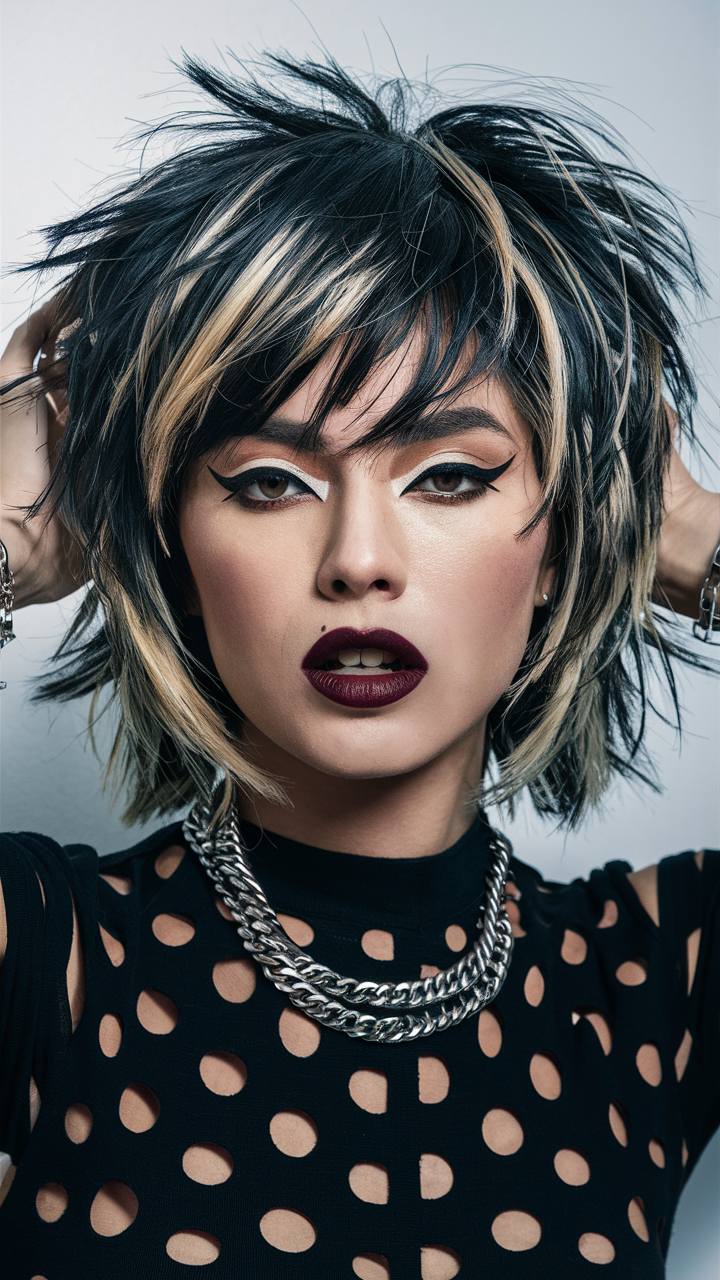 This bold shag hairstyle contrasts jet-black hair with striking blonde highlights for a dramatic effect. The choppy, layered cut adds edgy volume and texture, giving the style a rebellious vibe. Perfect for those looking to make a statement with contrasting tones.