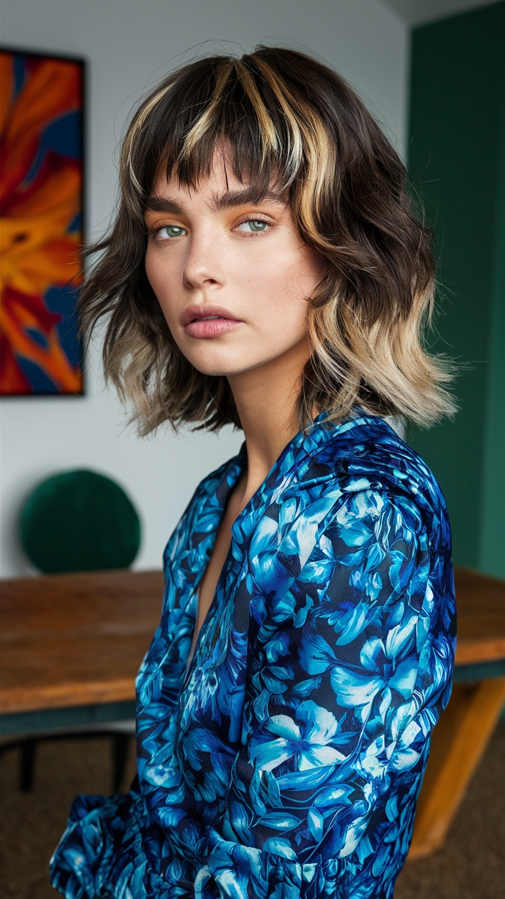 This shoulder-length shag features a rich brown base with delicate blonde streaks throughout. The soft, wavy layers and light fringe add movement and dimension, making the look both casual and polished. A chic choice for a subtle, modern take on highlights.