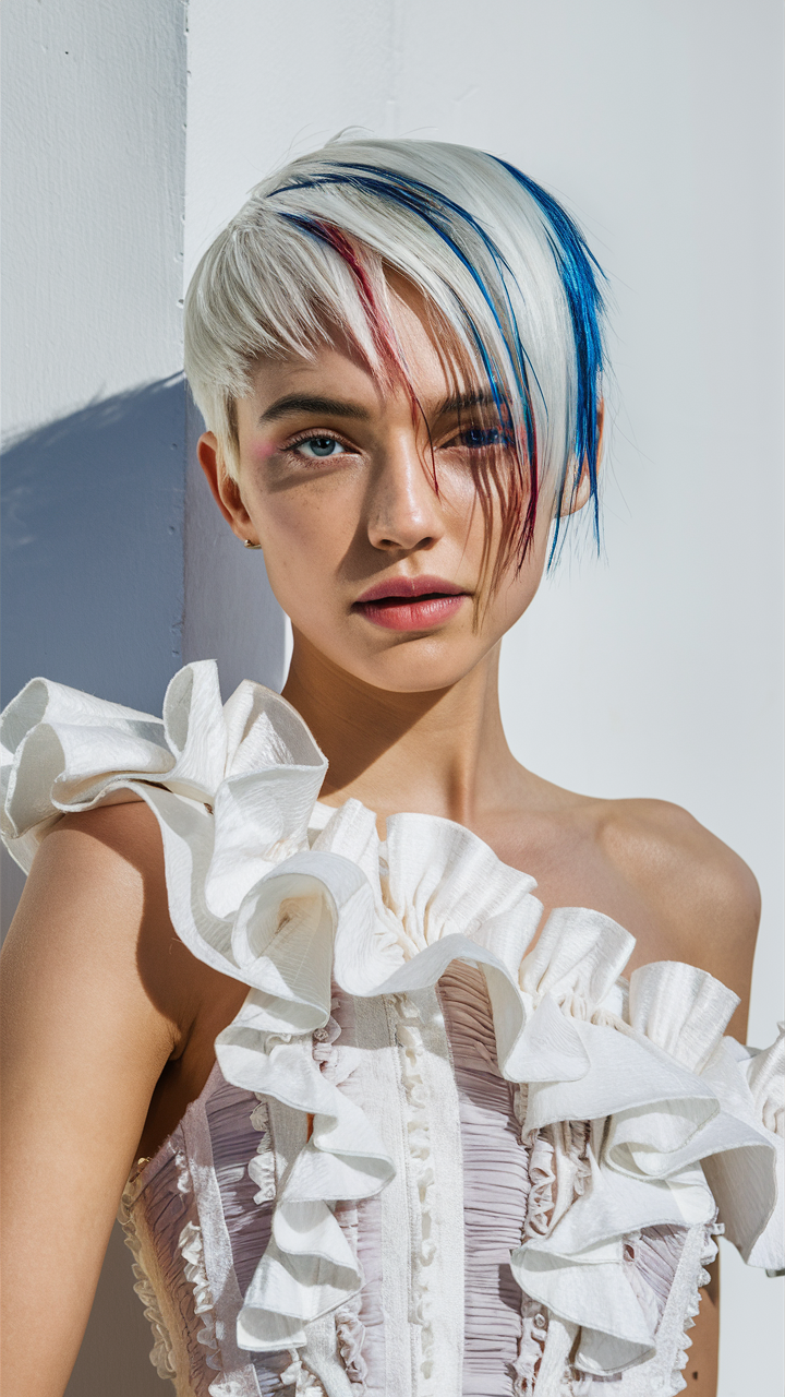 This platinum pixie is accented with bold red and blue streaks, adding a unique, artistic flair. The asymmetrical cut and vibrant colors create a striking contrast, perfect for a daring look. Ideal for those wanting a short, edgy hairstyle with a splash of color.