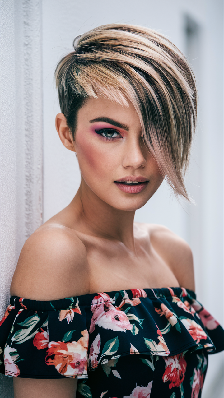 This blonde pixie features long, layered strands swept to one side, creating volume and dimension. The asymmetry and soft tones enhance the style’s sophistication, making it ideal for fine hair. This cut is a versatile choice, balancing elegance with an edgy twist.