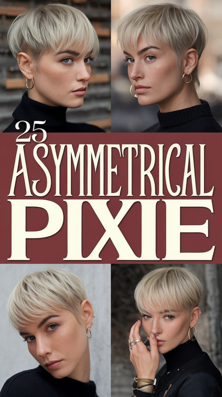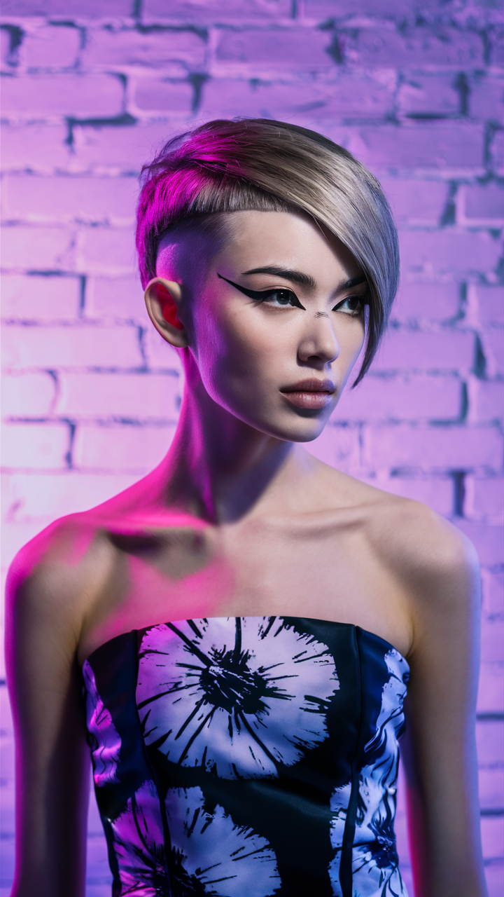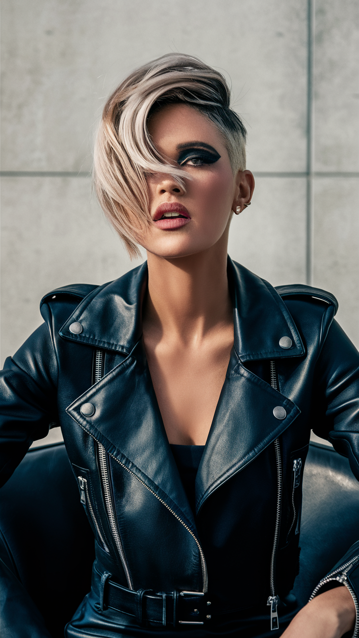 This platinum asymmetrical pixie showcases a long, side-swept section that adds a dramatic flair. The short, shaved side enhances the contrast, giving the style a bold, contemporary edge. This cut is perfect for those who want a statement-making short hair look with minimal styling effort.