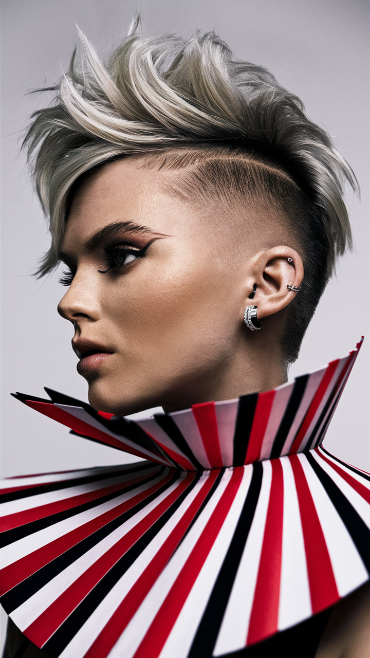 This platinum asymmetrical pixie stands out with a bold mohawk style and sharp shaved sides. The textured top adds height and volume, making it perfect for an edgy look. Ideal for those seeking a dramatic, undercut effect.