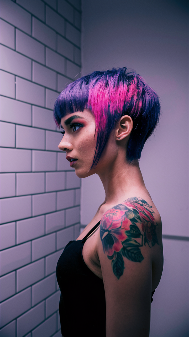 This pixie cut features a striking blend of purple and pink tones with sleek, layered strands. The structured cut and vibrant colors create a dramatic, modern effect. It’s a bold choice for anyone looking for a short haircut that’s both playful and daring.