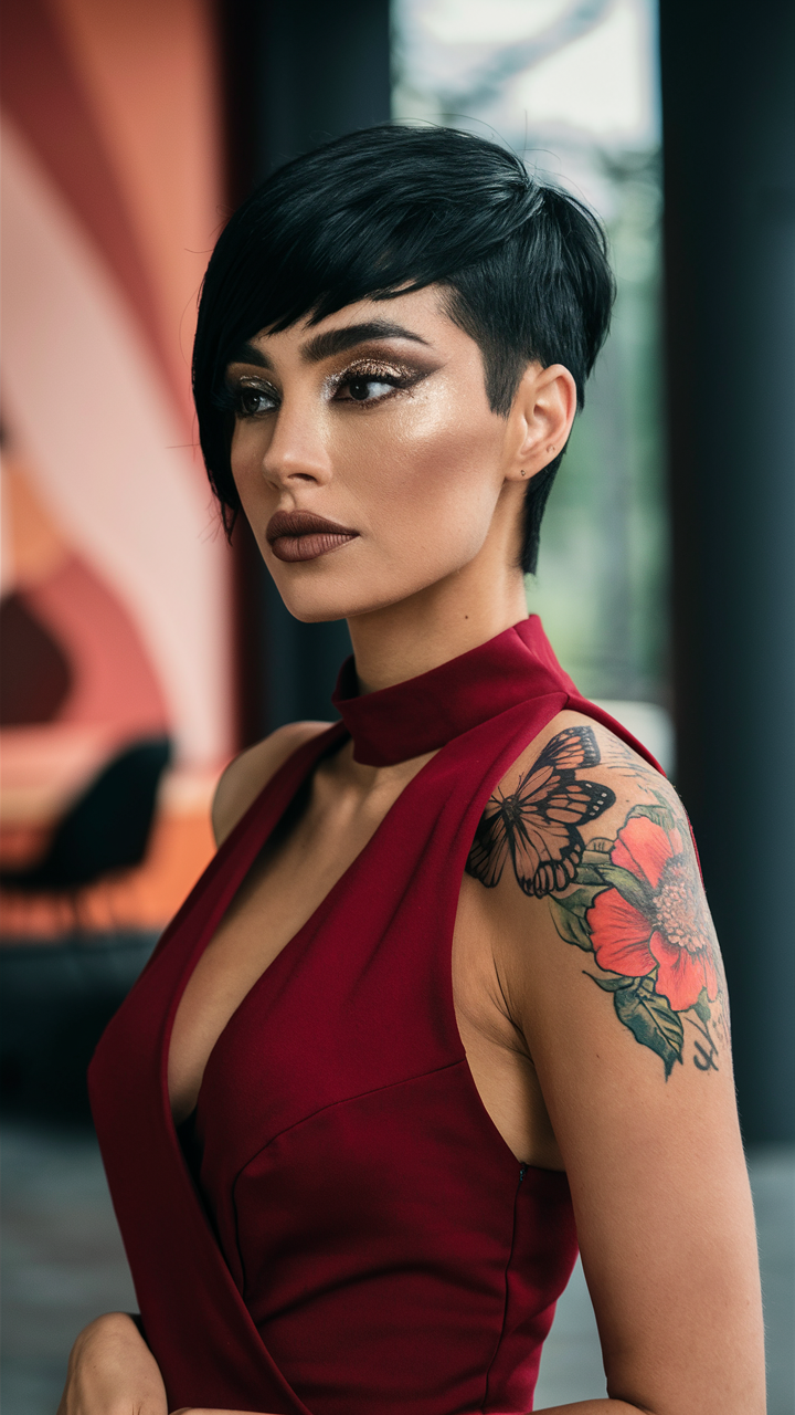 This jet-black pixie cut is asymmetrical, with a longer side sweep that adds drama and sharpness. The clean, short sides accentuate the longer top, providing a perfect frame for bold facial features. Ideal for those wanting a sleek, polished look with a touch of rebellion.
