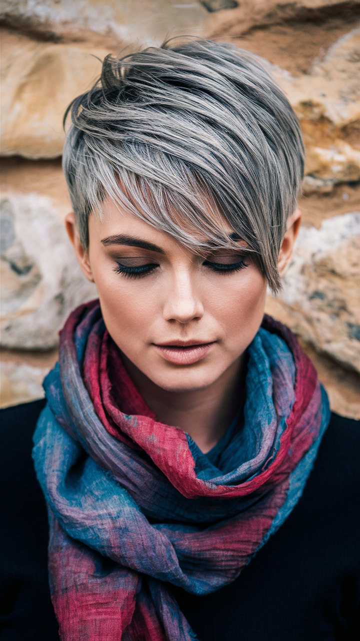 This layered silver pixie has textured bangs that give it a voluminous, dynamic appearance. The soft, feathery layers bring out the silver hues, offering dimension and movement. A sophisticated choice for adding a modern twist to classic short hair.