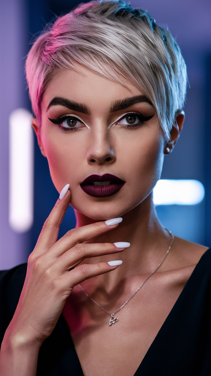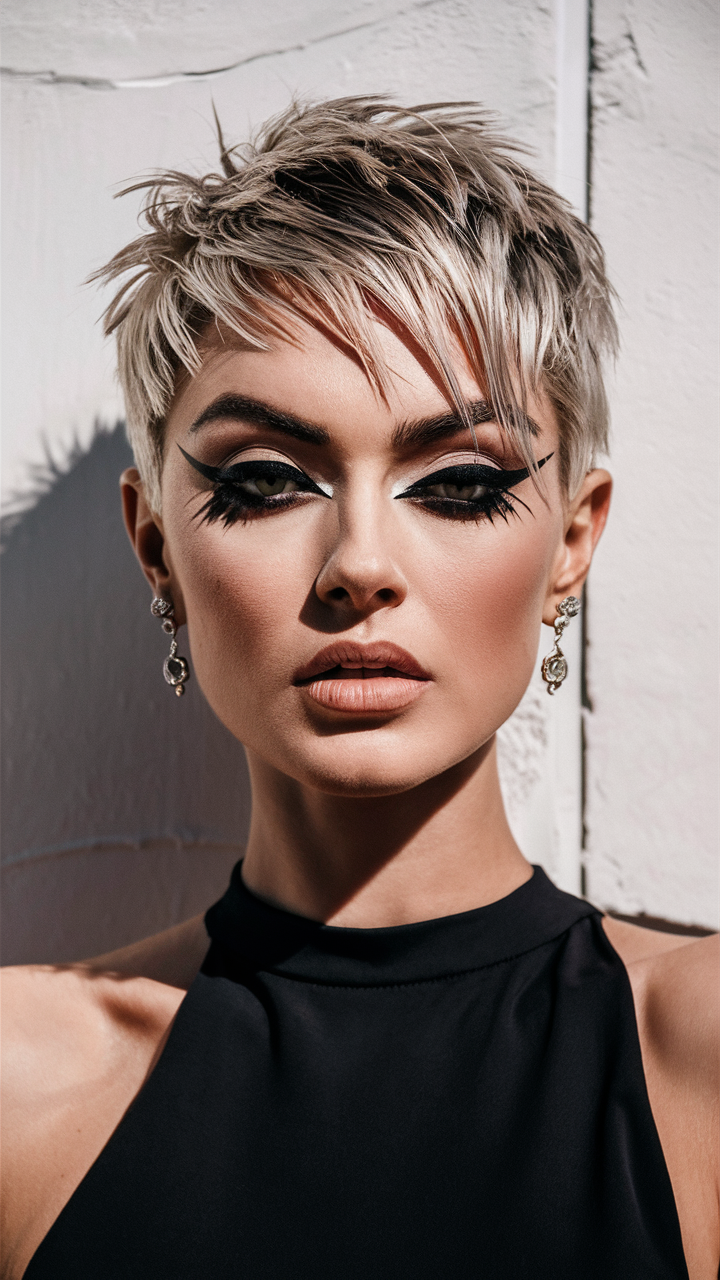 This platinum pixie cut features a bold, textured style that amplifies the drama. With an emphasis on choppy layers, the hairstyle brings a playful edge to the classic pixie shape. The platinum tone enhances the overall boldness, making each strand stand out.