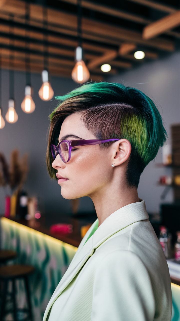 A striking green ombre cascades from a dark undercut, giving this hairstyle a modern twist. The vibrant green hue fades beautifully from rich emerald roots to a lighter lime towards the tips. The undercut keeps the style edgy and sharp, while the color gradient offers a refreshing, bold look.