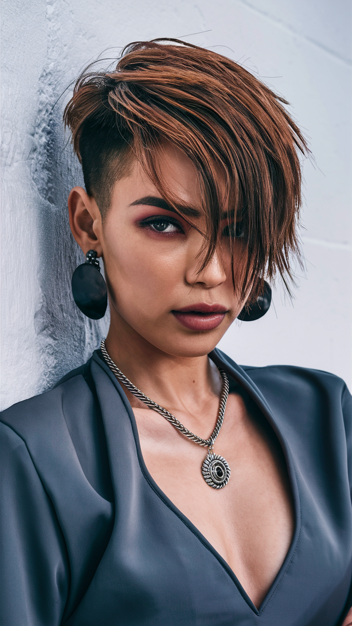 This asymmetrical cut in a rich copper shade adds warmth and energy to the look. With longer layers swept to one side and an undercut on the other, the style embraces contrast and movement. The tousled texture enhances the copper’s natural shine, adding a sense of carefree, effortless style.