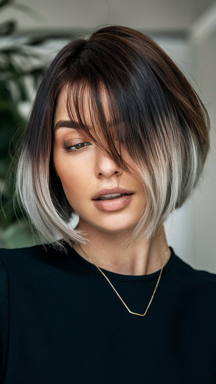This blunt bob features a dark-to-light ombre, with soft blonde ends and dark roots. Wispy bangs add a touch of texture, creating a relaxed, modern vibe. Perfect for fine hair, this style offers volume without being high-maintenance.