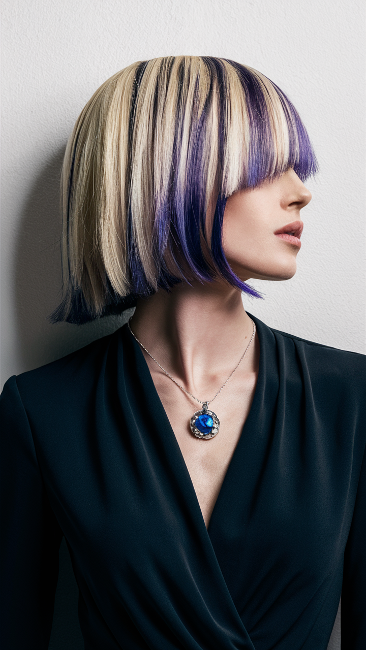 This edgy blunt bob combines blonde and purple tones, giving a striking layered effect. The color contrast adds depth, while the blunt cut with bangs keeps it sleek and modern. Ideal for women seeking a bold, textured style in 2025.