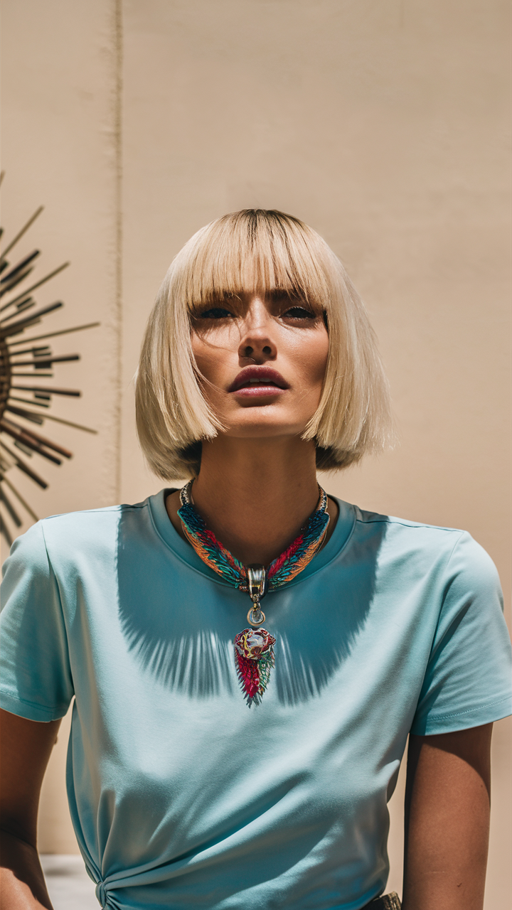 A timeless platinum bob with a precise, chin-length cut and straight bangs, this look is all about clean lines. The bright blonde shade highlights the sharp edges, creating a polished and refined appearance. Perfect for a sleek, modern vibe that suits fine hair.