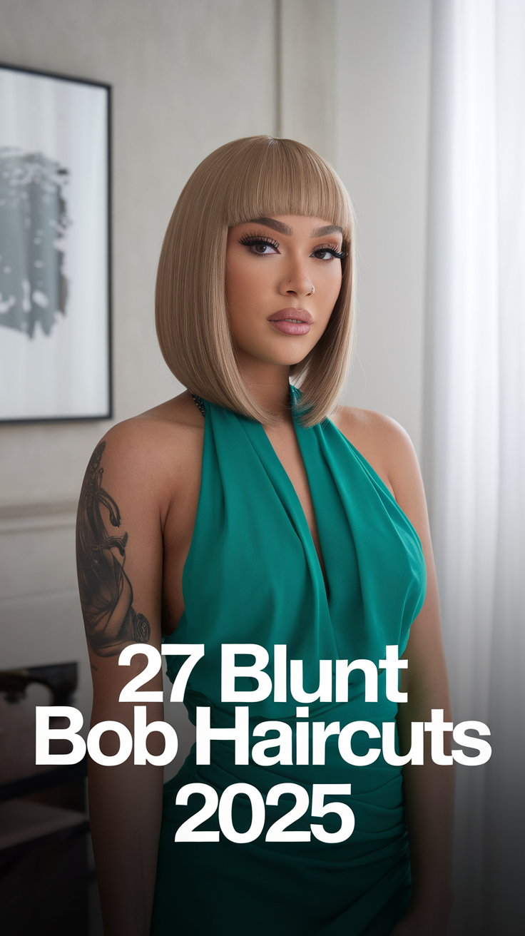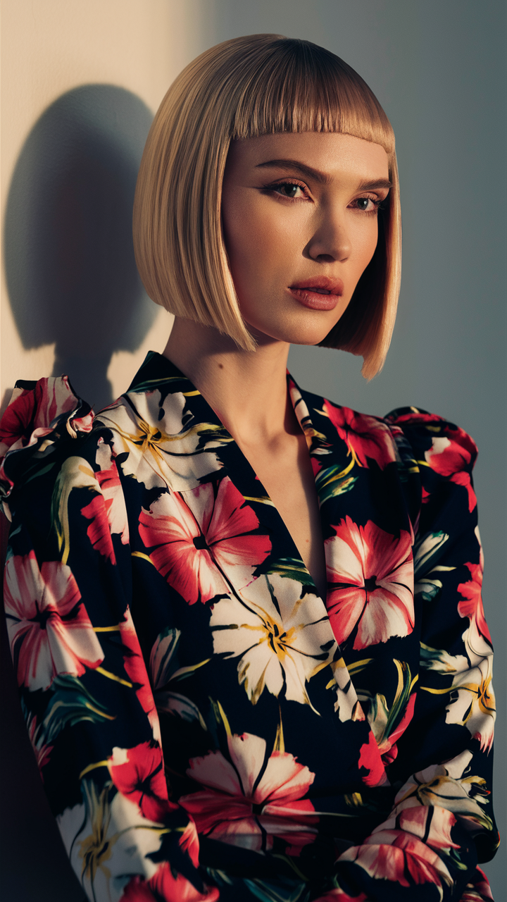 This blunt bob features a soft, natural blonde with wispy bangs for a relaxed, sun-kissed look. The cut is slightly textured, adding volume and movement while staying low-maintenance. A great choice for a cute and effortless summer style.