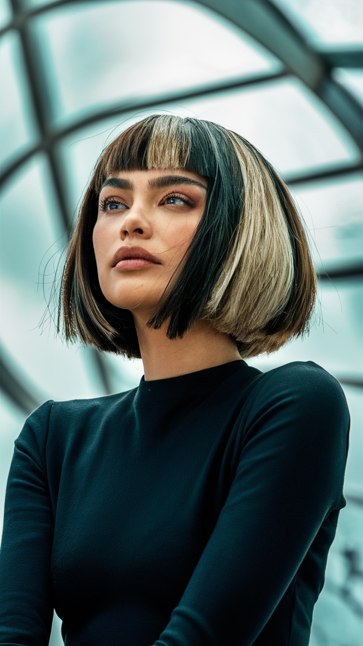 This blunt bob combines deep black with chunky blonde highlights for a bold, contrasting effect. The straight cut and layered color add depth and dimension to the hairstyle. Perfect for women wanting a modern, statement-making look.