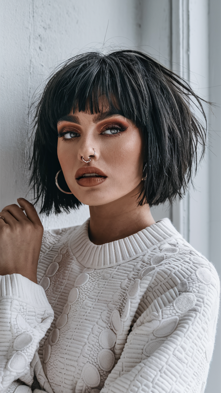 This blunt bob has a textured, slightly messy finish, with shaggy bangs adding a playful touch. The edgy layers create volume, making it an ideal choice for fine hair. A modern take on a classic style, it’s cute yet effortlessly cool.