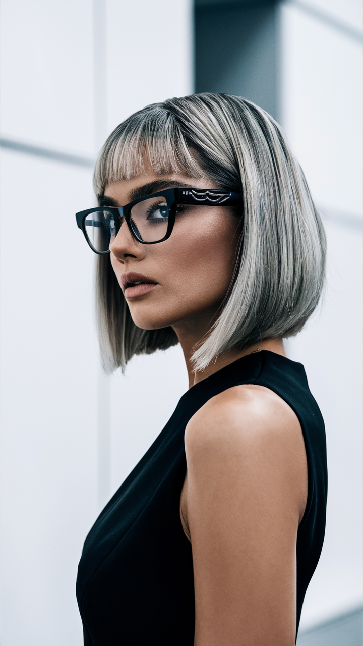 A sleek ash gray blunt bob with precise, straight bangs, this cut offers a cool, sophisticated vibe. The straight, shoulder-length cut highlights the smooth texture, making it ideal for a polished, contemporary style. Perfect for those looking for a professional, edgy look.