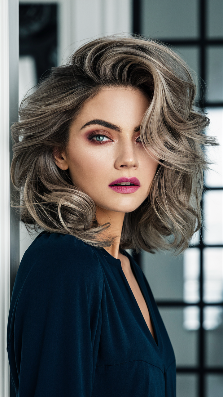 This look combines sleek, silver-toned ash blonde with long, sweeping side bangs for a dramatic effect. The cool ash tones add sophistication, while the layered lengths enhance movement and texture. It’s a bold, eye-catching style for those embracing edgy elegance in 2025.