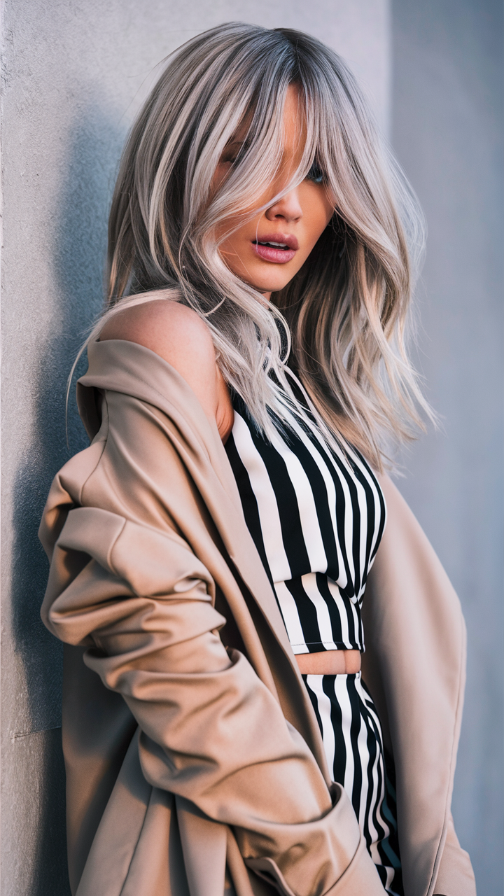 This ash blonde style is voluminous and textured, featuring subtle dark highlights that add depth. The high lift in the crown area creates a dramatic silhouette, perfect for those seeking a bold look. This color and style suit both casual and high-fashion settings, making it versatile for 2025 trends.