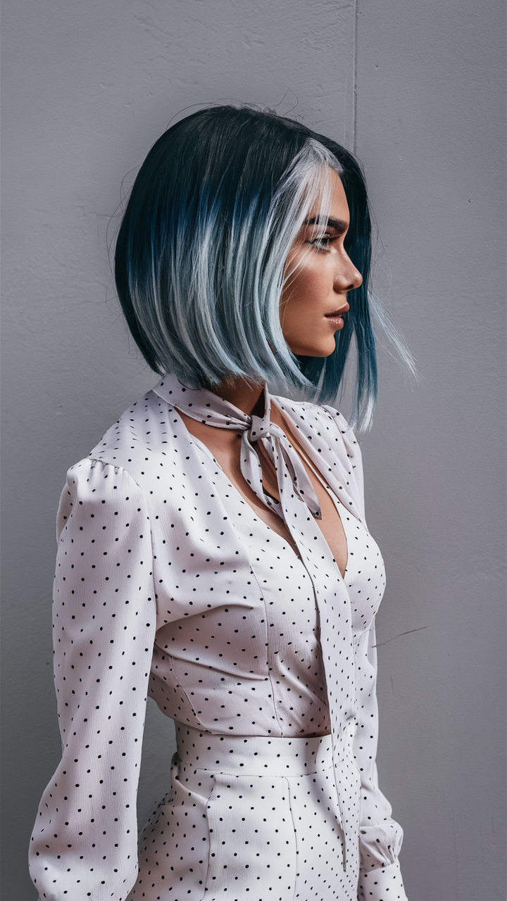 This angled lob features a daring blend of deep black roots transitioning into cool blue tones. The ombre effect adds depth and modern flair to the classic lob, ideal for those wanting a unique twist. The straight texture keeps the look sleek, highlighting the haircut’s sharp lines.