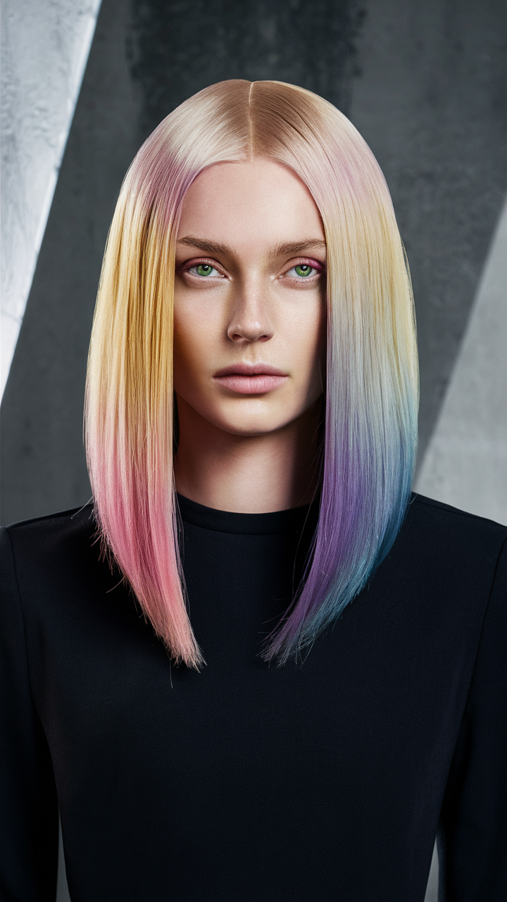 A smooth, straight lob with a pastel rainbow effect, blending soft pink, purple, and blue tones. The sleek texture keeps the colors vibrant and eye-catching, perfect for adding a playful twist to the Classic Lob 2025 trend. This shoulder-length style brings a bold yet soft look for those who love colorful hair.