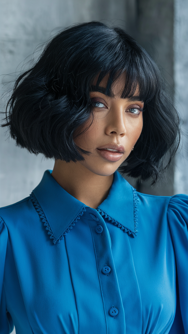 This short, wavy bob in deep black is full of movement and texture, ideal for a soft, voluminous look. The slightly choppy bangs add a playful touch, complementing the tousled waves perfectly. Perfect for those wanting a lively, carefree style with a chic twist.