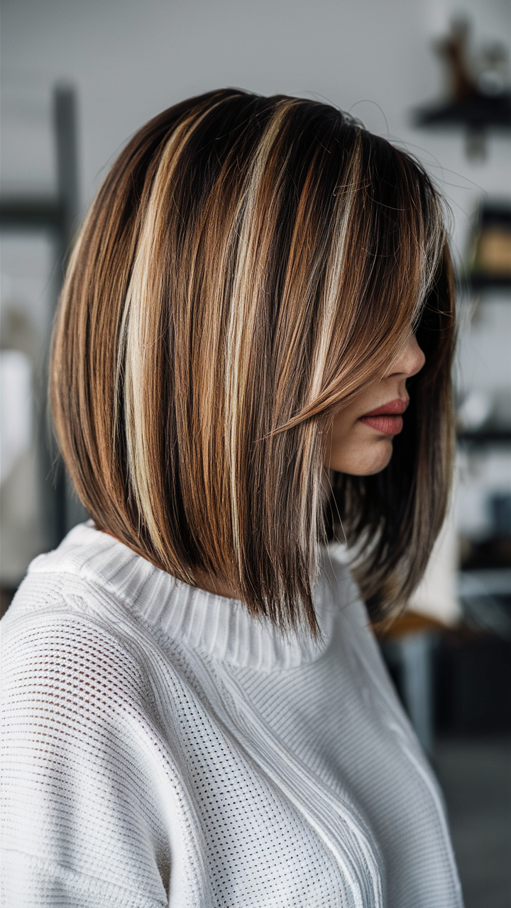 This sleek lob features rich brunette tones accented with bold caramel highlights for added depth. Blunt bangs frame the face, bringing attention to the eyes and adding a classic yet edgy feel. This style combines sharp lines with warm colors, making it a standout look for 2025.