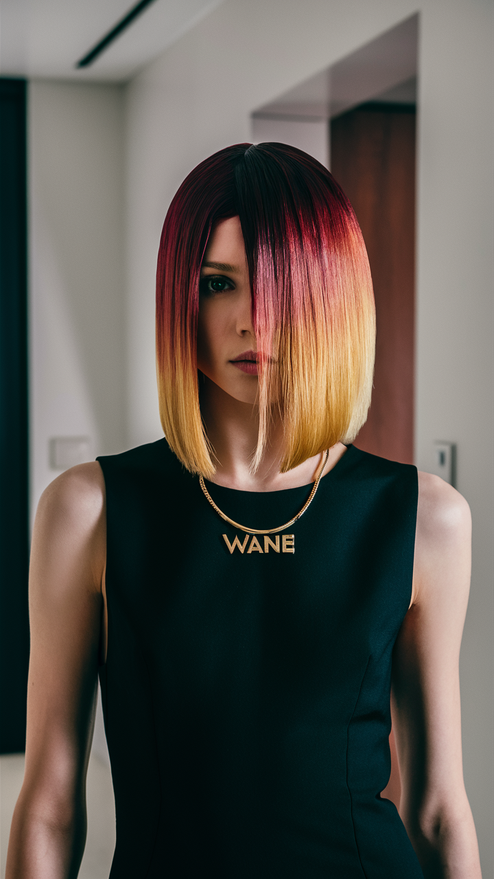 This striking lob combines a daring ombre blend of deep red at the roots transitioning into vivid yellow at the ends. The straight cut emphasizes the color gradient, creating a bold, statement-making look. Perfect for those wanting to add a vibrant twist to the Classic Lob 2025 trend.
