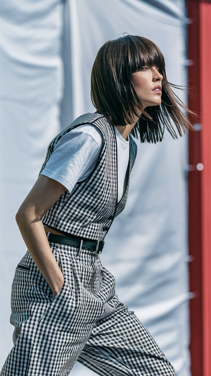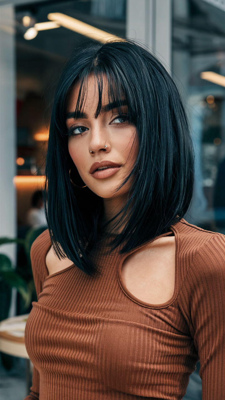 This choppy lob combines rich, dark tones with full bangs that bring focus to the eyes. The textured cut adds movement and depth, creating a modern, edgy vibe. Ideal for thick hair, this style balances structure and softness.