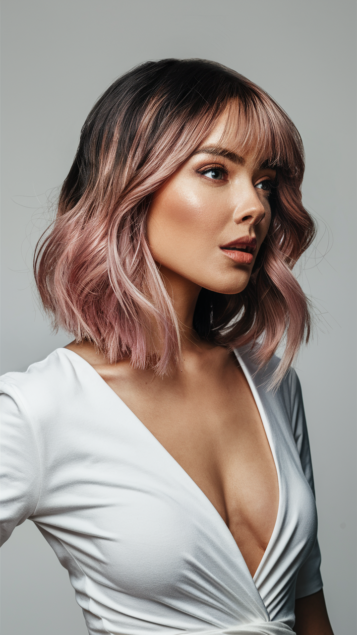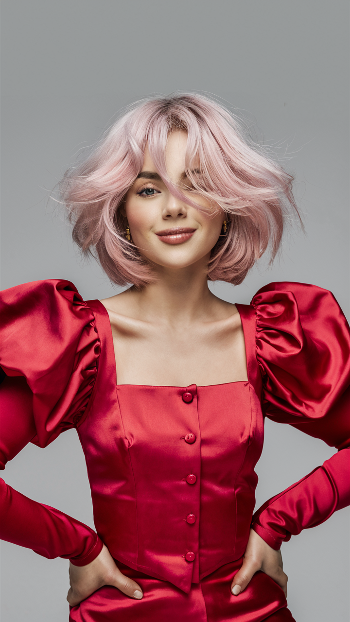 This playful lob embraces a pastel pink color with airy, tousled waves for a fun, vibrant style. The layered cut adds volume and movement, giving the hair a soft, fluffy texture. Perfect for making a bold yet sweet statement with a pop of color.
