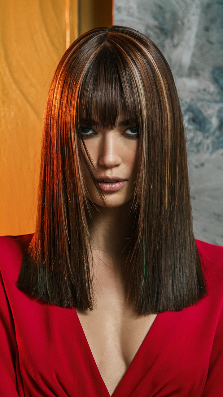 This sleek lob is styled with full, blunt bangs and a rich brunette color, creating a bold, structured look. The even, straight cut emphasizes precision and brings a polished feel to the hairstyle. Perfect for anyone seeking a powerful, statement-making lob.