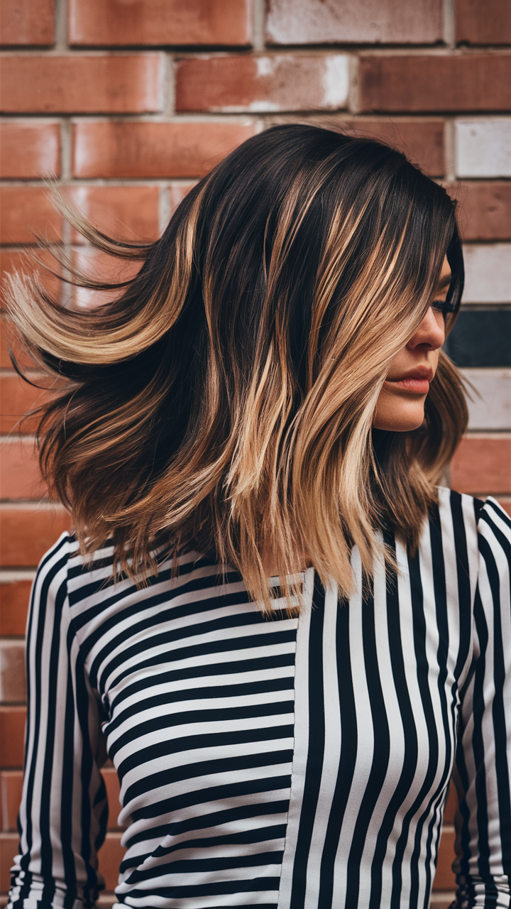 This textured lob features a deep brunette base with bold caramel highlights that create a natural, sun-kissed effect. The layers and waves add movement, making it look lively and voluminous. Ideal for adding dimension to thick hair while keeping it lightweight and fresh.