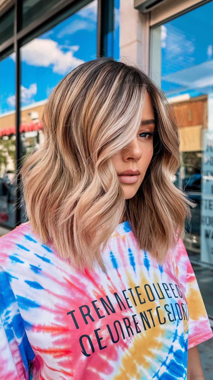 This wavy lob blends dark roots with a soft pink ombre, creating a subtle yet stylish color gradient. The loose waves add volume and texture, enhancing the overall playful vibe. It’s a fresh, modern choice for anyone looking to add a touch of color to the Classic Lob 2025 trend.