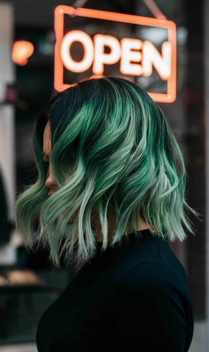 This classic lob showcases a daring emerald green shade that transitions seamlessly into lighter mint tips, creating a gradient effect. The soft waves add texture and movement, giving the hairstyle a lively, playful look. This vibrant cut is ideal for those looking to make a bold statement with their hair.