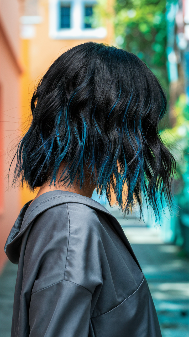 Dark, almost black hair is enhanced by electric blue highlights subtly woven throughout, adding depth and intrigue. The wavy texture of this medium-length lob brings out the contrast between the dark and bright tones, giving it a modern, edgy appearance. Perfect for anyone wanting a splash of color without overwhelming their natural tone.