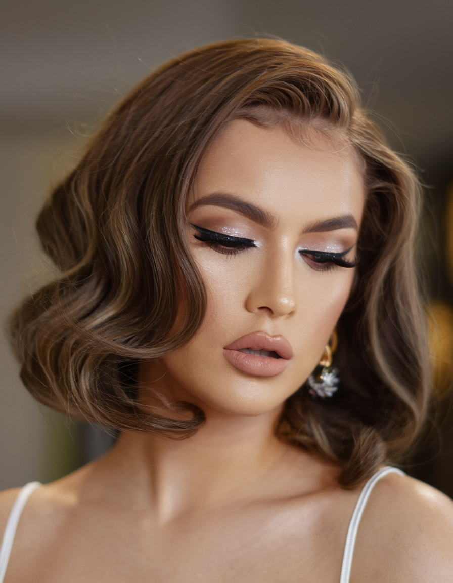 The first hairstyle exudes a sense of timeless elegance, making it perfect for wedding guests or formal events. This trendy fall hairstyle for short hair 2024 features voluminous, smooth waves styled away from the face, enhancing the makeup’s natural glow. The sleekness and precision of the waves create a sophisticated yet simple look, ideal for women seeking an easy and elegant style for any formal occasion. Whether you’re heading to a prom, wedding, or a fancy office event, this look is both chic and practical.