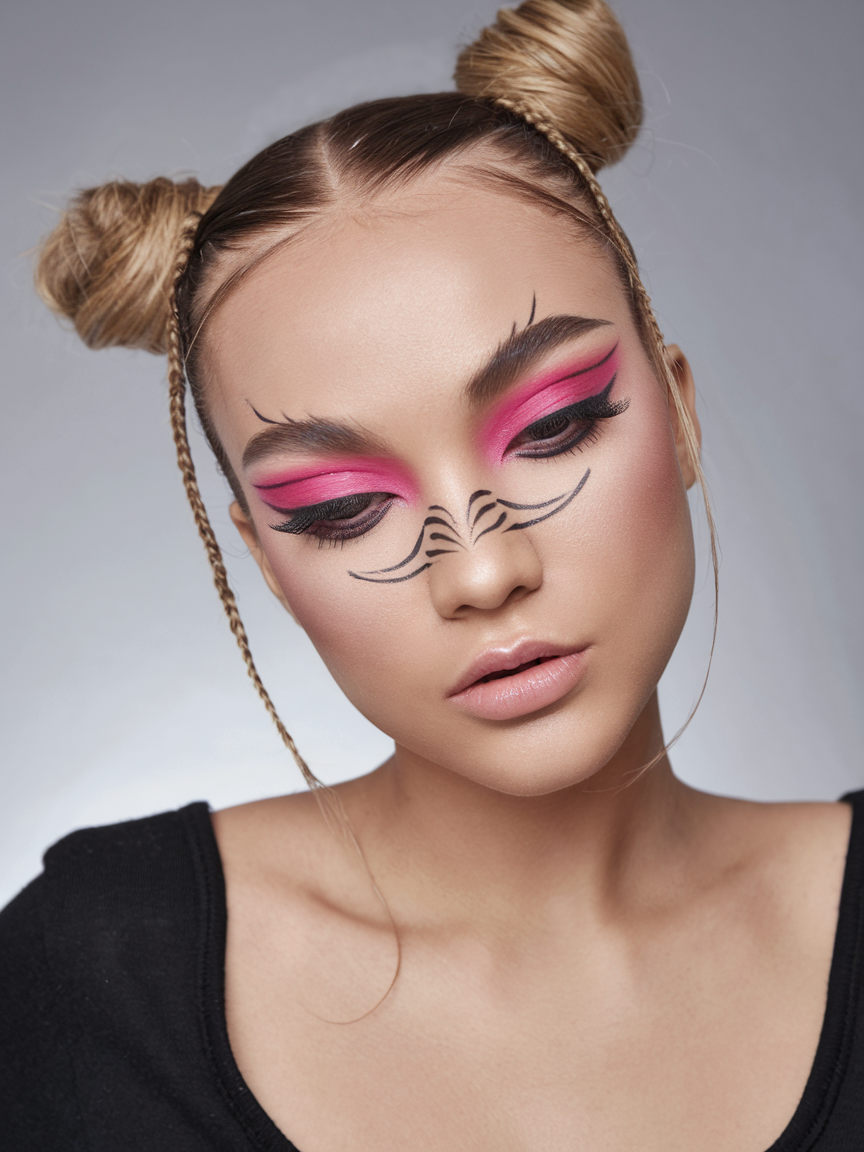 This fairy-inspired look features braided details with space buns, offering a cute and trendy style for prom or a fun wedding guest event. The playful braided accents and bold makeup make this look stand out while still being easy and quick to style. It’s an ideal choice for women seeking something pretty yet unconventional, perfect for fall festivals or sports events where a fun and functional look is essential.