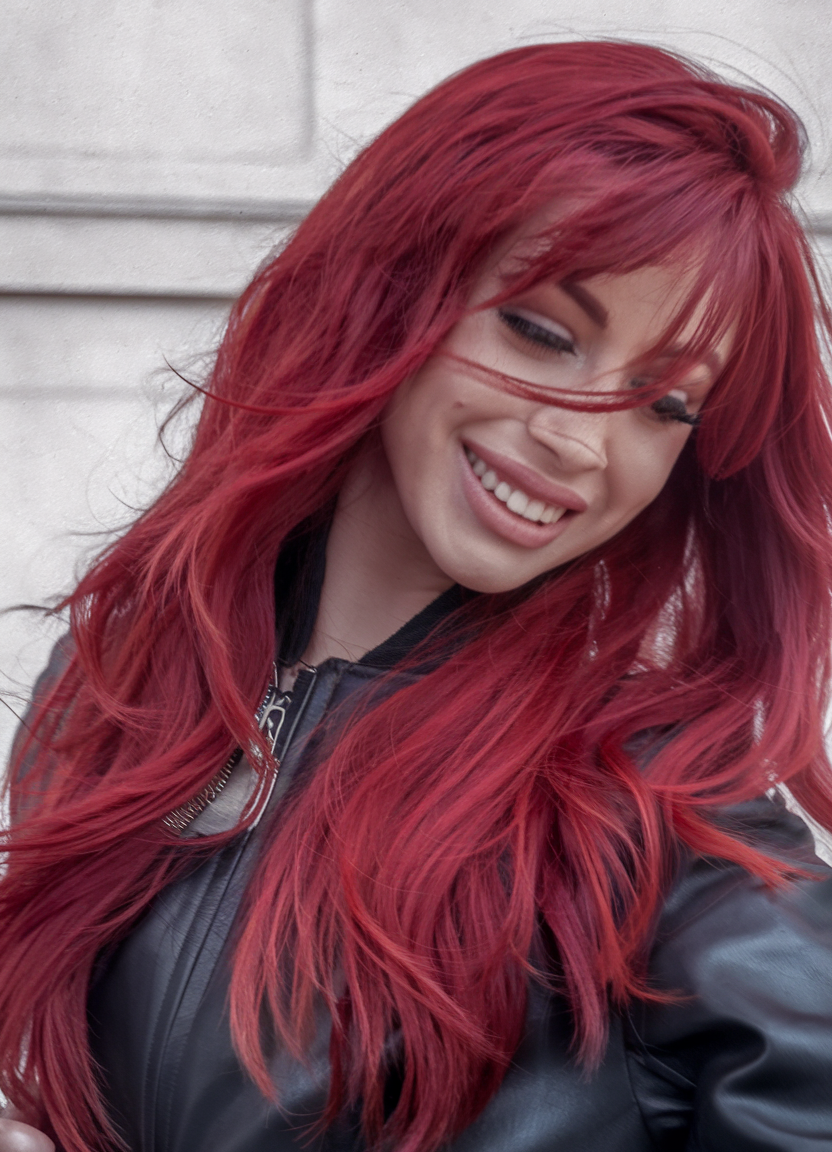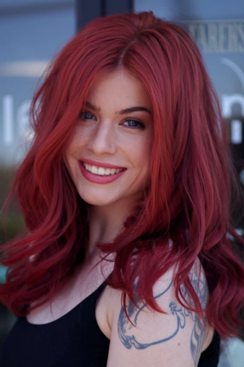 This long ruby red hairstyle is full of movement and energy, making it perfect for those looking to embrace the vibrant hues of fall 2024. The wind-tossed effect adds an effortlessly cool vibe, ideal for outdoor photoshoots or casual outings. It’s a fun, cute style that mixes simplicity with a splash of color, offering an easy-going aesthetic that will turn heads this season.
